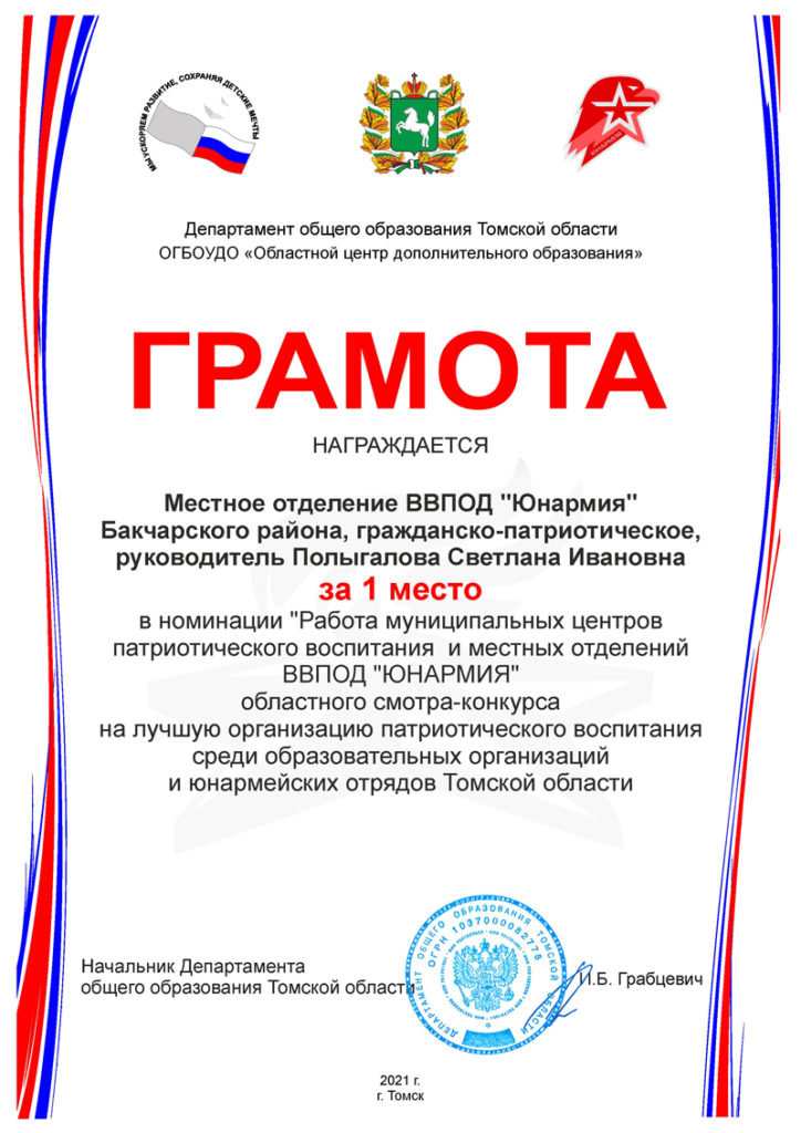 По итогам смотра – конкурса в номинации «Работа муниципальных центров патриотического воспитания и местных отделений ВВПОД «ЮНАРМИЯ» одним из победителей стало Местное отделение ВВПОД «Юнармия» Бакчарского руководителем которого является Зелинская Елена Александровна, координатором Полыгалова Светлана Ивановна.