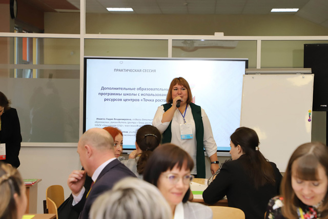 Лидия Владимировна Имаева и Павел Валентинович Имаев провели практико-ориентированный мастер-класс в формате «карусель» практических сессий на тему «Дополнительные образовательные программы школы с использованием ресурсов центров «Точка роста»».