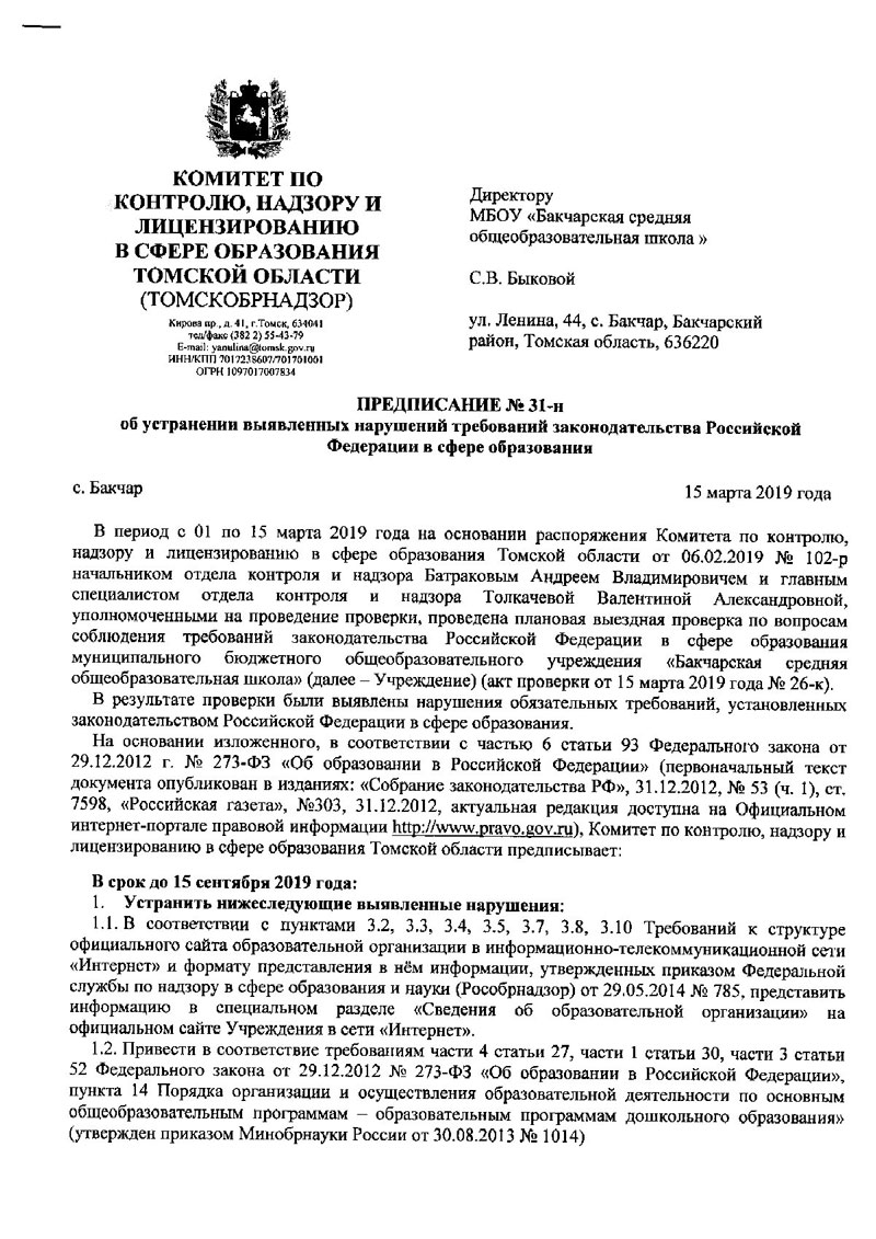 Предписание №31-н от 15 марта 2019 года об устранении выявленных нарушений требований законодательства Российской Федерации в сфере образования