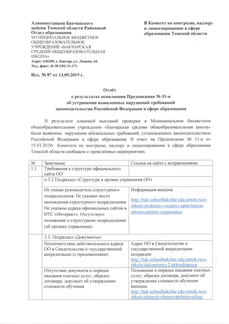 Отчет о результатах исполнения Предприсания №31-н об устранении выявленных нарущений требований законодательства Российской Федерации с сфере образования