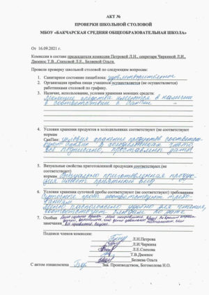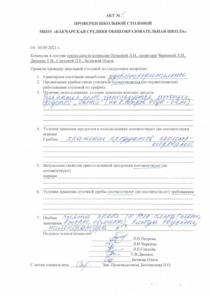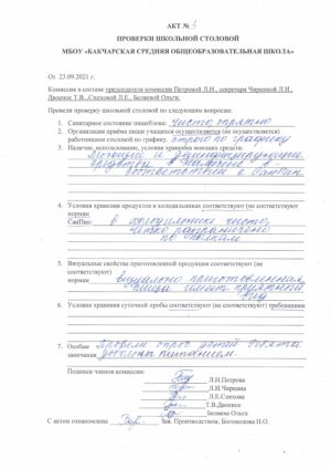 Протокол №1 от 18.09.2023 проверки школьной столовой МБОУ «Бакчарская СОШ»