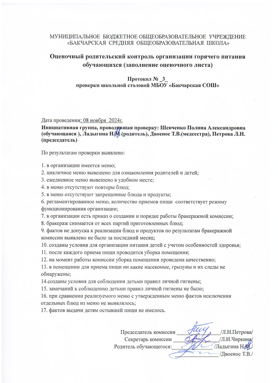Протокол №3 от 20.10.2023 проверки школьной столовой МБОУ «Бакчарская СОШ»