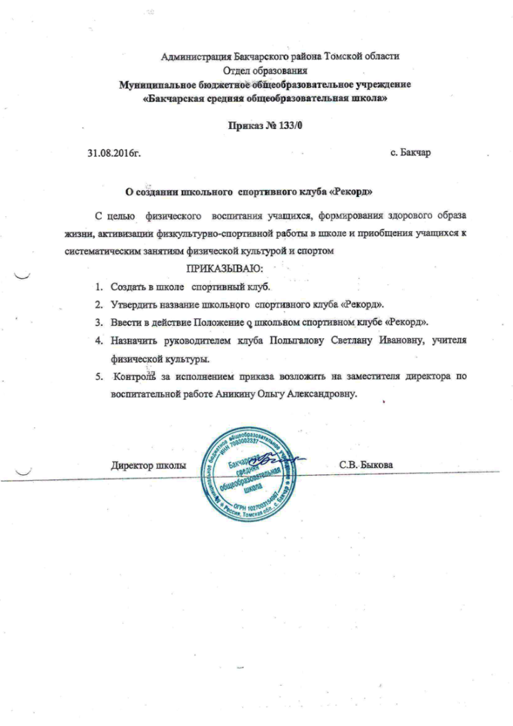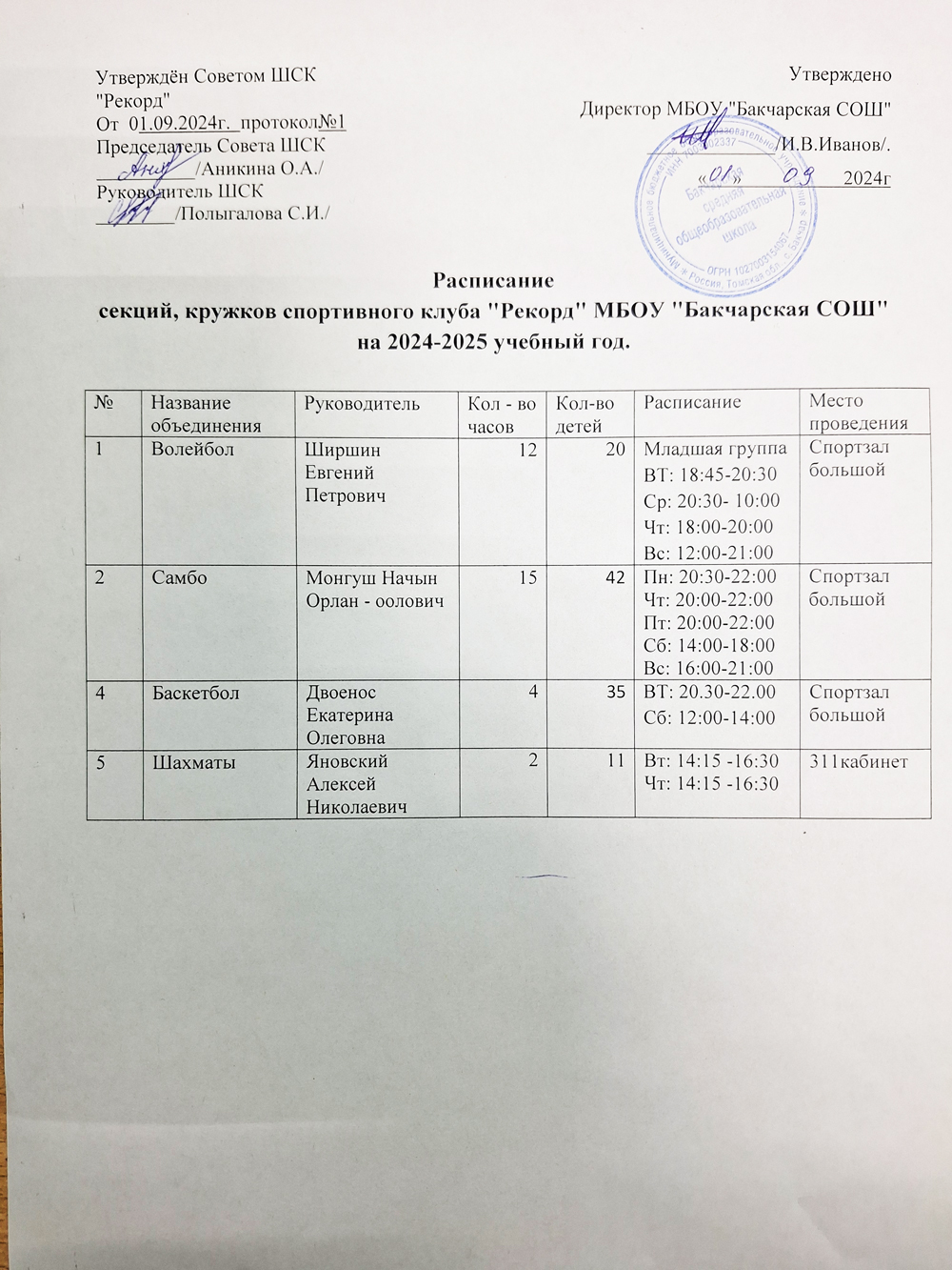 Расписание секций, кружков спортивного клуба «Рекорд» МБОУ «Бакчарская СОШ» на 2024-2025 учебный год